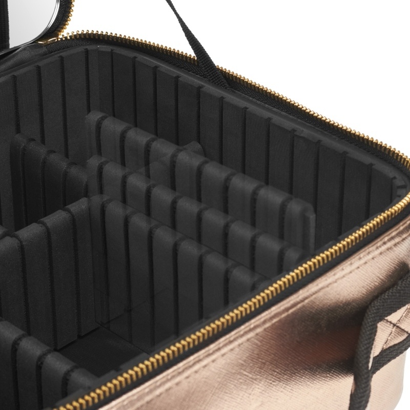 Stor luksus makeup boks fra MAP by Gillian Jones. Med denne makeup boks får du et utal af muligheder for opbevaring af din makeup og beauty produkter. Boksen er lavet i slidstærkt nylon, lukkes med kraftige lynlås i guld, og har et stort håndtag til nem transportering. Inden i boksen er der mulighed for at opdele, og selv indrette rummene, med de aftagelige sider. Boksen har et stort spejl i låget, der via seler kan holdes oppe. Boksen har også et aftageligt inder-låg til opbevaring af bl.a. makeup pensler eller små beauty produkter.
